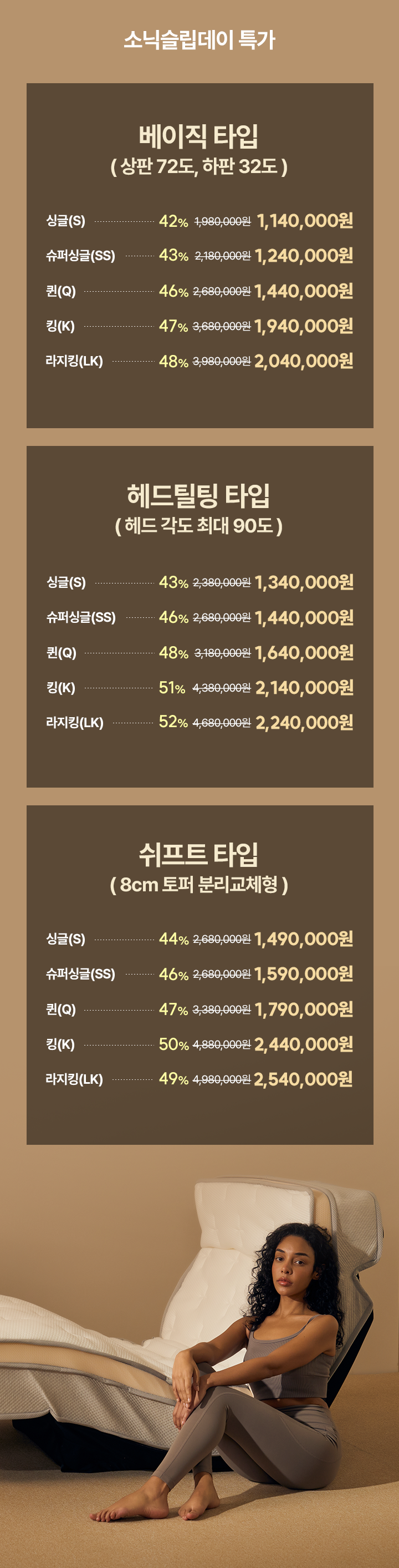 비수도권 : 베이직/헤드틸팅 - 싱글, 슈퍼싱글 280,000원 / 퀸 320,000원 / 킹 360,000원 / 라지킹 480,000원